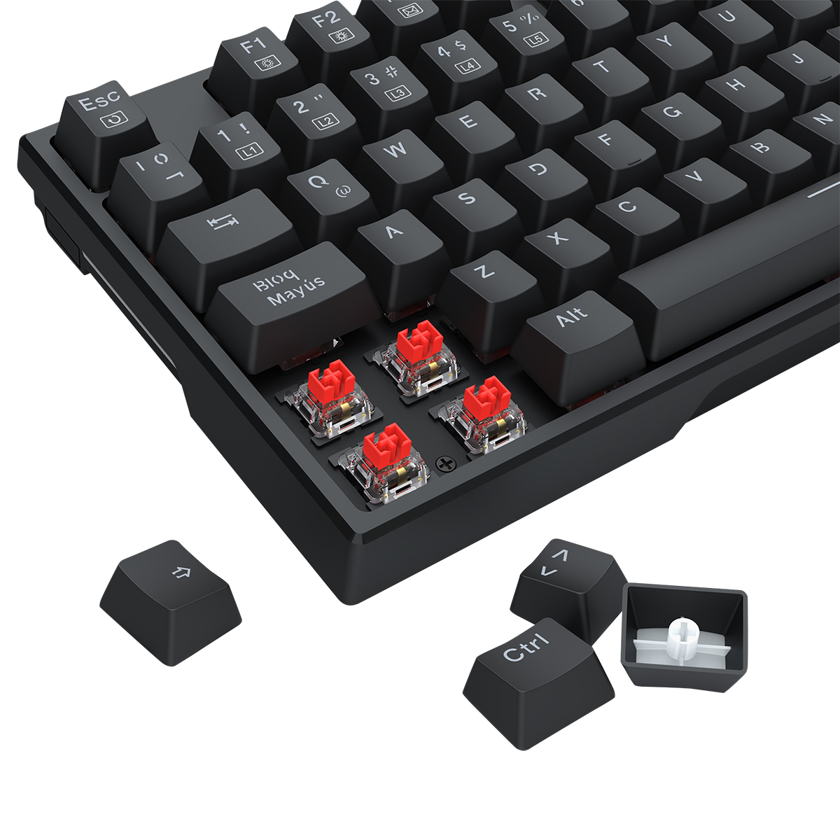 Interruptores Hot-Swappable Red: Interruptores mecánicos lineales que ofrecen una experiencia de escritura suave y silenciosa. Compatibles con switches de 3 y 5 pines, brindan la posibilidad de personalización total.